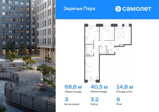 Строим кварталы для жизни с заботой о будущем. Предлагается 3-комнатная квартира бизнес-класса 68,6 кв.м в корпусе 3.2 на 8 этаже, в ЖК ''Заречье Парк''Квартира с чистовой отделкой. Доступность дополнительных опций уточняйте у застройщика.Приобрести квартиру возможно по специальным акциям от застройщика, с текущими условиями акций можно ознакомиться в блоке ''Акций''.Цена динамическая и может отличаться, уточняйте актуальность у застройщика.''Заречье Парк'' — жилой комплекс бизнес-класса рядом с Мещерским парком и инновационным центром ''Сколково''. Элитный квартал в голландском стиле создан по авторскому архитектурному проекту. Из окон открывается живописный вид на парк. Приватные дворы закрыты от машин, а на зеленой территории — разнообразные места для отдыха, игр и спорта. Жителям доступны своя поликлиника, школа и детский сад. Все квартиры — с готовой отделкой в нейтральной гамме.