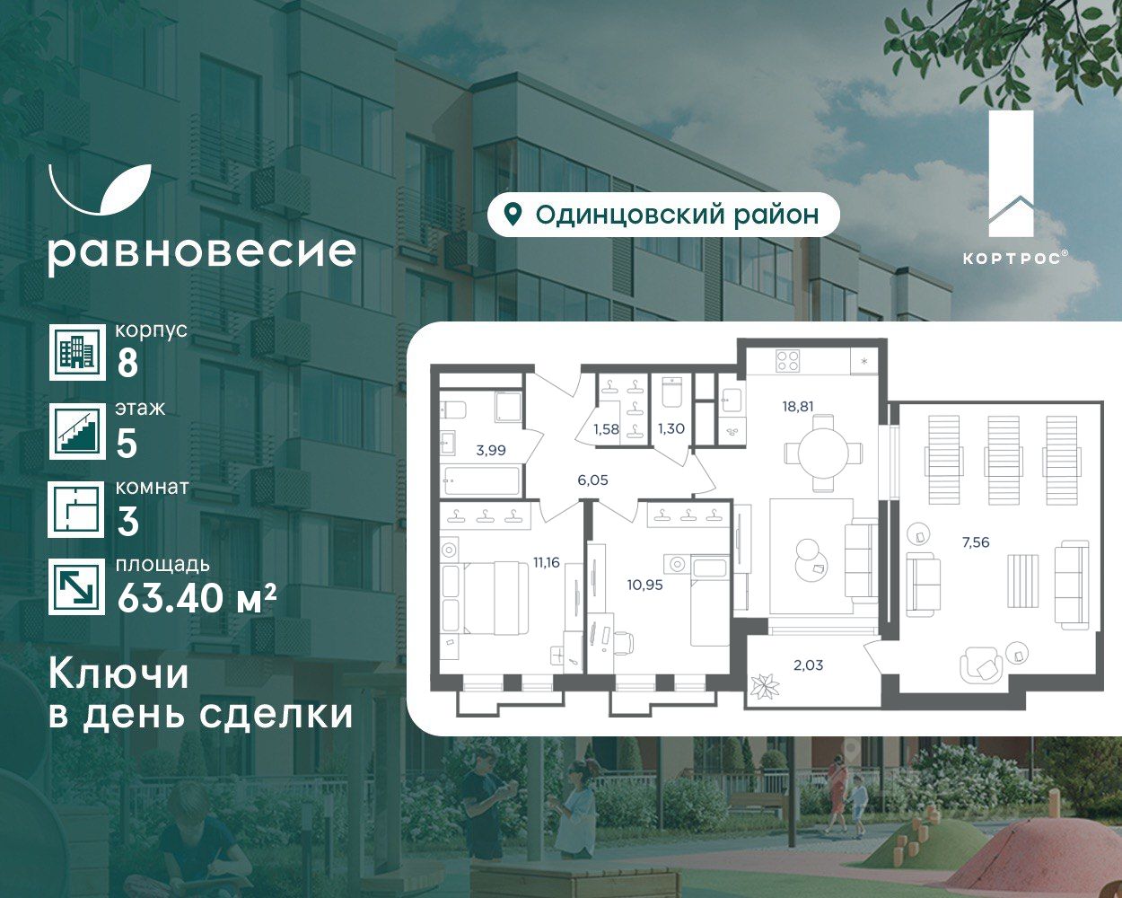 Продаётся квартира с 3 комнатами общей площадью 63.40 кв. метров на 5 этаже жилого квартала комфорт-класса ''Равновесие''.