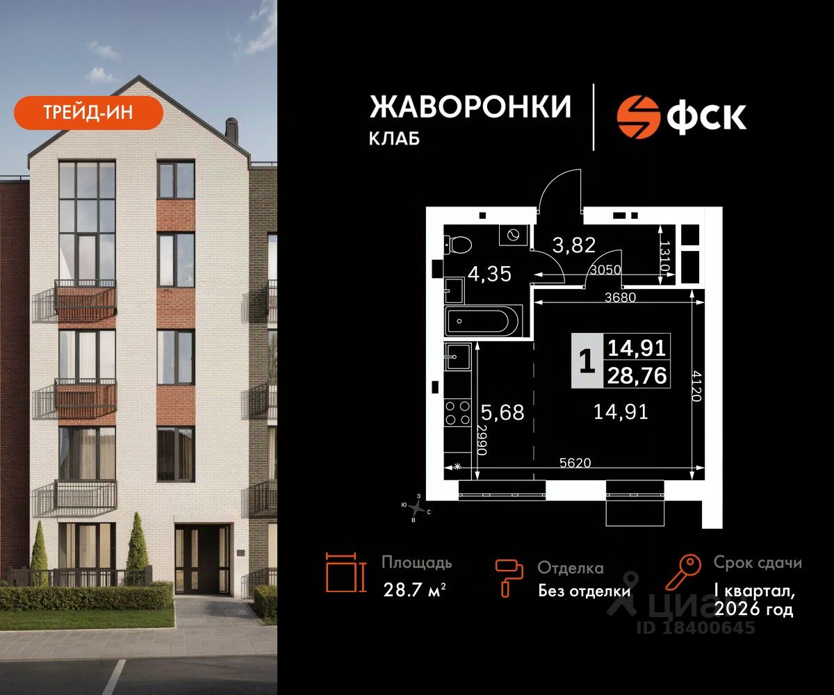 Прямая продажа от застройщика! Загородный жилой комплекс класса Комфорт Плюс. Продаётся студия номер 20 общей площадью 28.76 кв.м на 2-м этаже 4 этажного дома. Без отделки.
