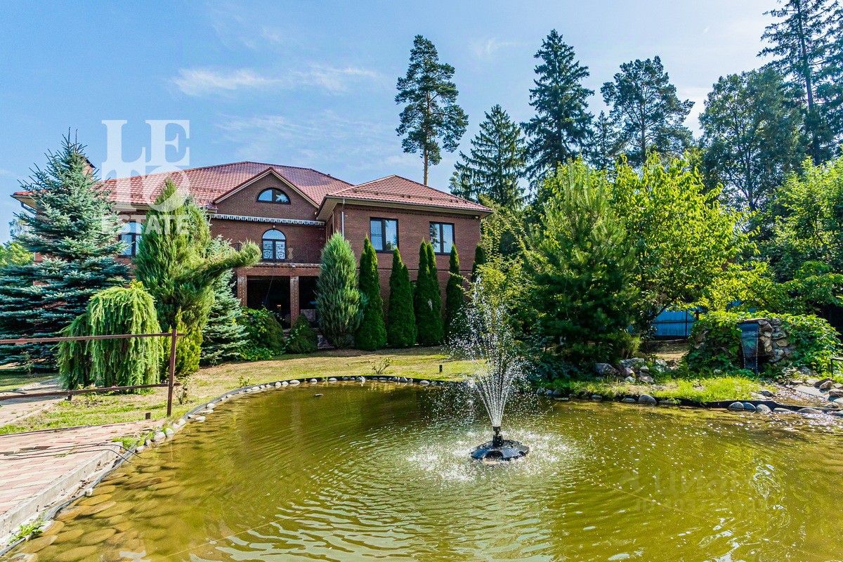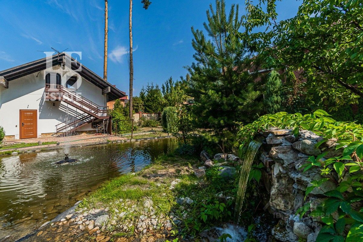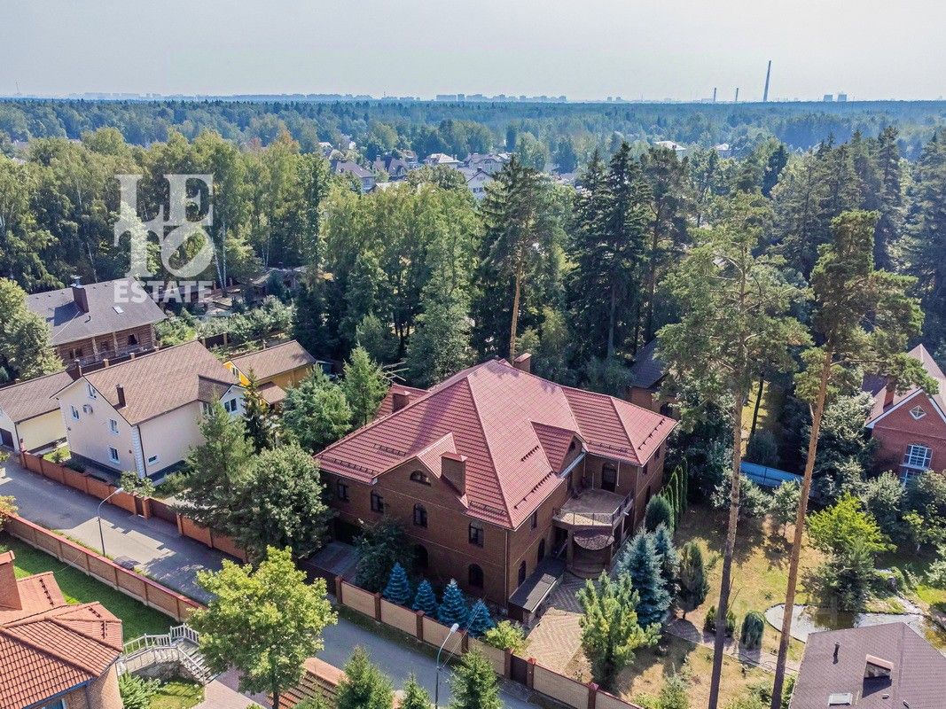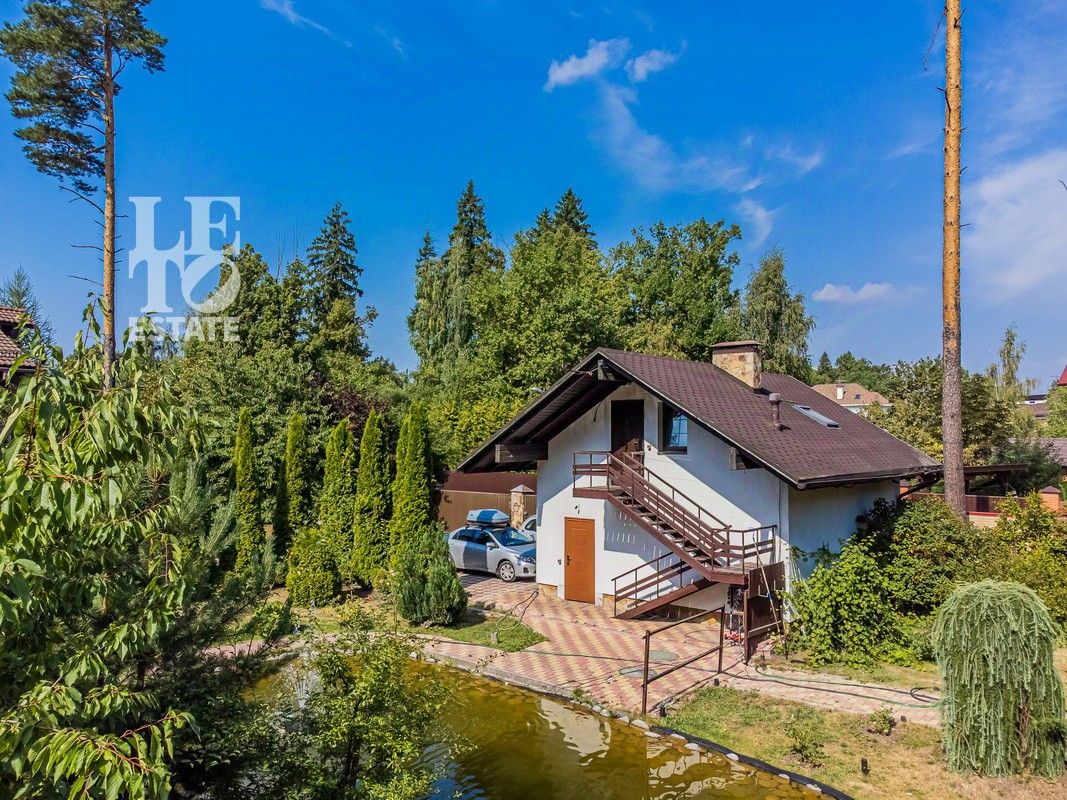 Дом 2013 года постройки, состоит из двух этажей, а также цокольного, полностью меблирован и готов к проживанию, ремонт выполнен из дорогих, высококачественных материалов. Центром притяжения в доме, является большой холл с массивной лестницей из кавказского дуба и вторым светом. Также дом располагает пятью спальнями, зимним садом с зоной барбекю и террасой, зоной СПА с бассейном и сауной, в мансарде расположен спортзал. Дом стоит на монолитно-ленточном фундаменте глубиной 2,4 м. В стоимость входит отдельно стоящее здание с гаражом на первом этаже и квартирой для персонала на втором этаже. Несколько уровней подготовки и очистки воды. Все коммуникации центральные, отопление газовым котлом, мощностью 60 кВт. На участке выполнен ландшафтный дизайн, дорожки вымощены тротуарной плиткой, высажены плодовые, а также хвойные деревья, дубы, кустарники, цветы, виноград. Украшает сад пруд с фонтаном и рыбками. Поселок под круглосуточной охраной. До Пироговского водохранилища 4 км.