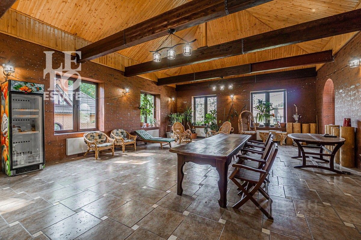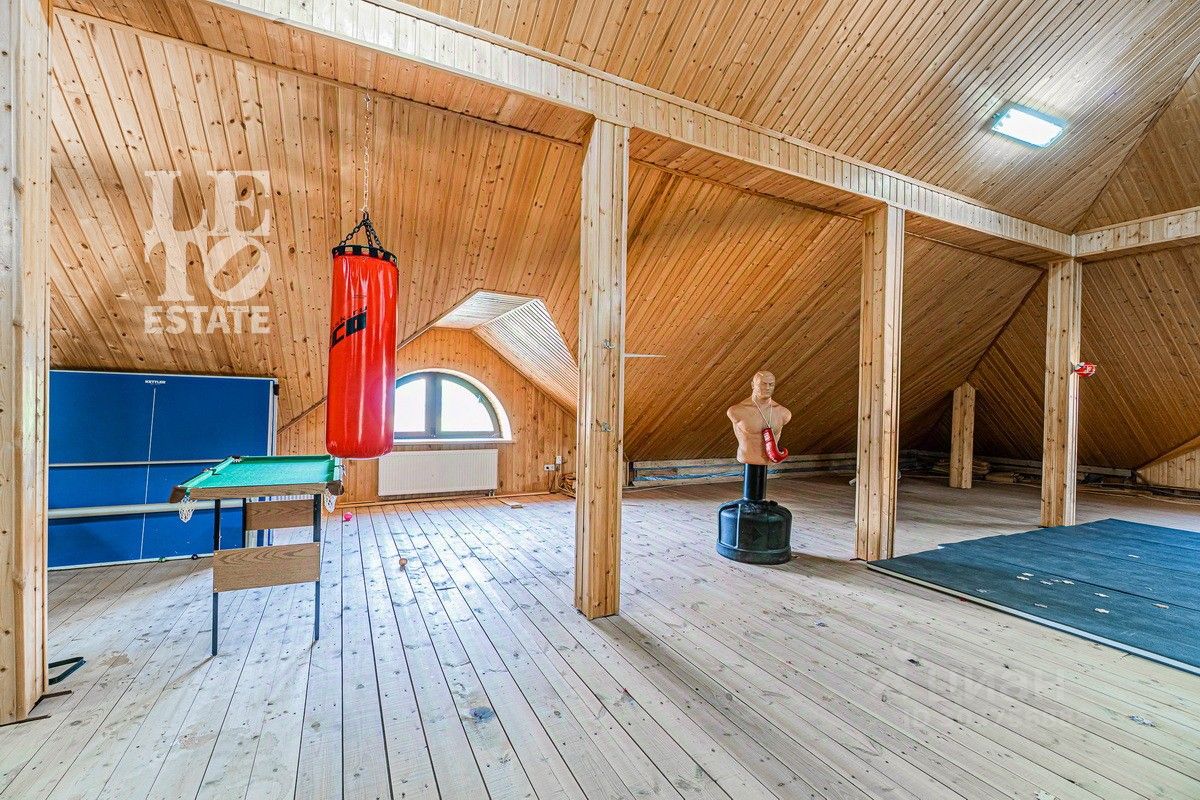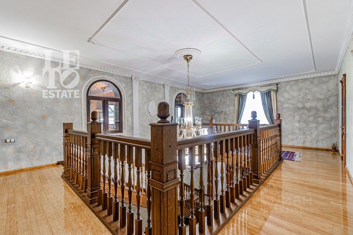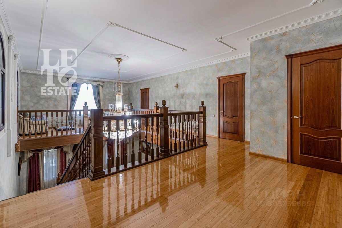 Дом 2013 года постройки, состоит из двух этажей, а также цокольного, полностью меблирован и готов к проживанию, ремонт выполнен из дорогих, высококачественных материалов. Центром притяжения в доме, является большой холл с массивной лестницей из кавказского дуба и вторым светом. Также дом располагает пятью спальнями, зимним садом с зоной барбекю и террасой, зоной СПА с бассейном и сауной, в мансарде расположен спортзал. Дом стоит на монолитно-ленточном фундаменте глубиной 2,4 м. В стоимость входит отдельно стоящее здание с гаражом на первом этаже и квартирой для персонала на втором этаже.