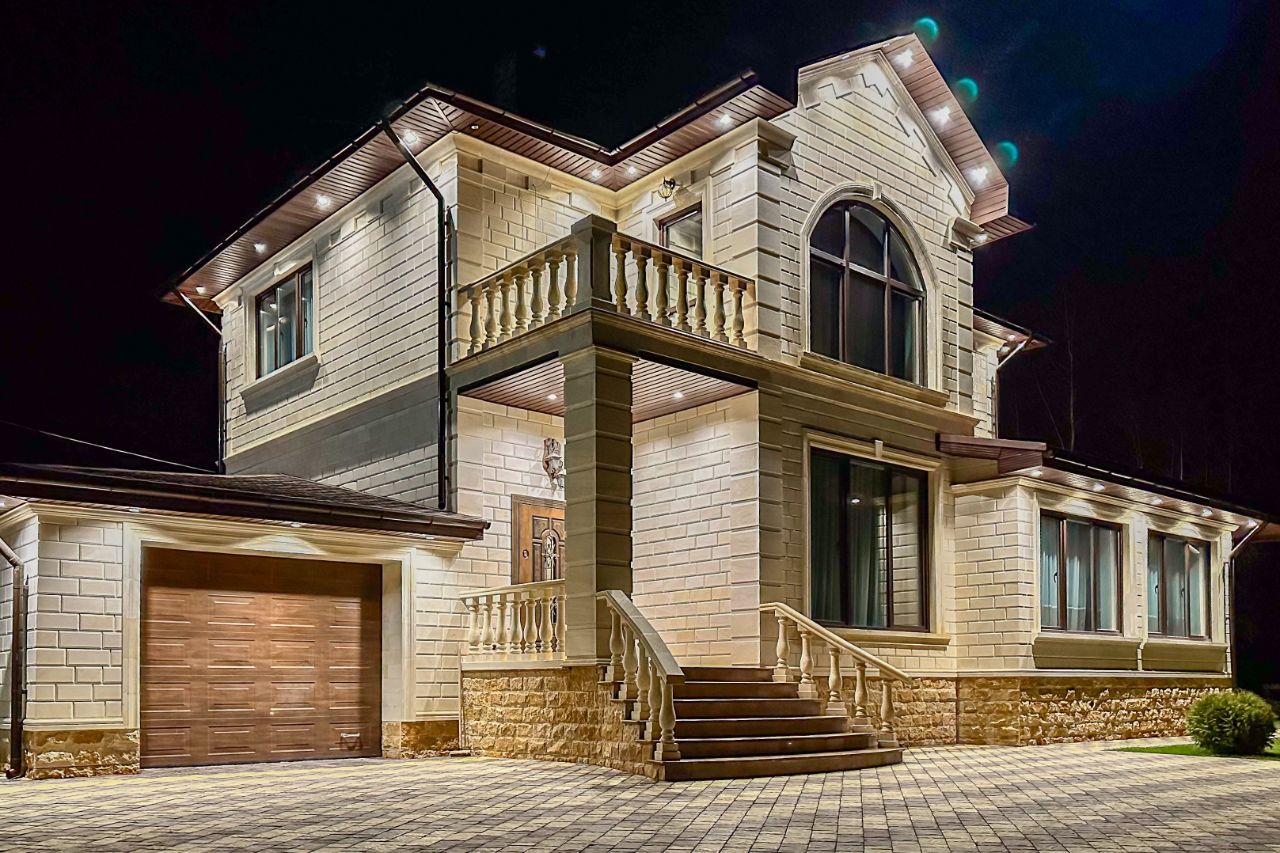 О доме: - Двух этажный дом 221 м2. - Материал стен: газобетон D400, по периметру утеплен, облицован Дагестанским песчаником. - Фундамент: ленточный, глубина 2 метра. - Перекрытия: железобетонные плиты. - Крыша: утеплена, покрыта мягкой кровлей. - Окна: тройные стеклопакеты. - Подсветка фасада. - Дом построен по проекту, согласно всех технических и строительных норм.