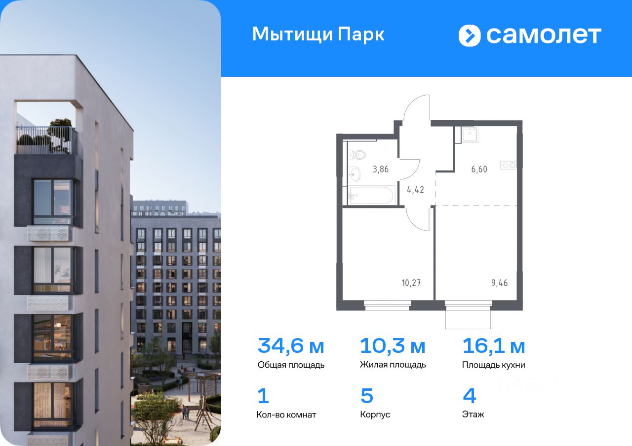 Предлагается 1-комнатная квартира комфорт-класса 34,61 кв.м в корпусе 5 на 4 этаже, в ЖК ''Мытищи Парк''