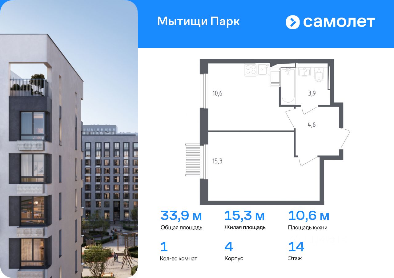 Предлагается 1-комнатная квартира комфорт-класса 33,9 кв.м в корпусе 4 на 14 этаже, в ЖК ''Мытищи Парк''
