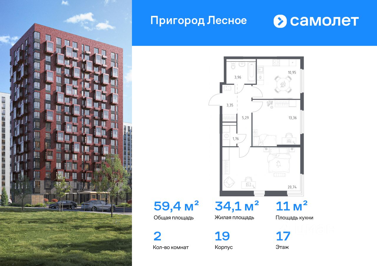 Строим кварталы для жизни с заботой о будущем. Предлагается 2-комнатная квартира комфорт-класса 59,41 кв.м в корпусе 19 на 17 этаже, в ЖК ''Пригород Лесное'' Квартира без отделки. Доступность опции ''отделка'' и возможность комплектации мебелью и декором уточняйте у застройщика.