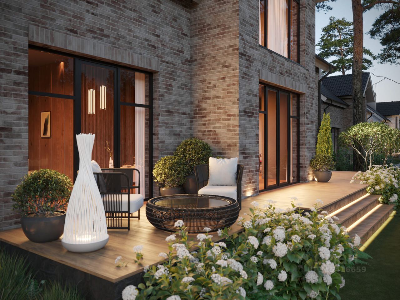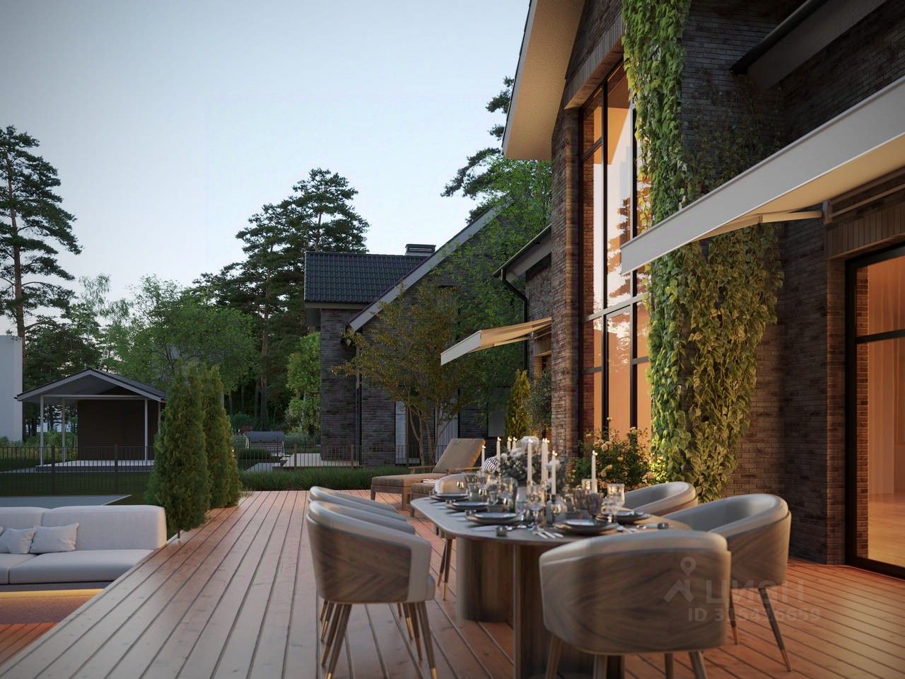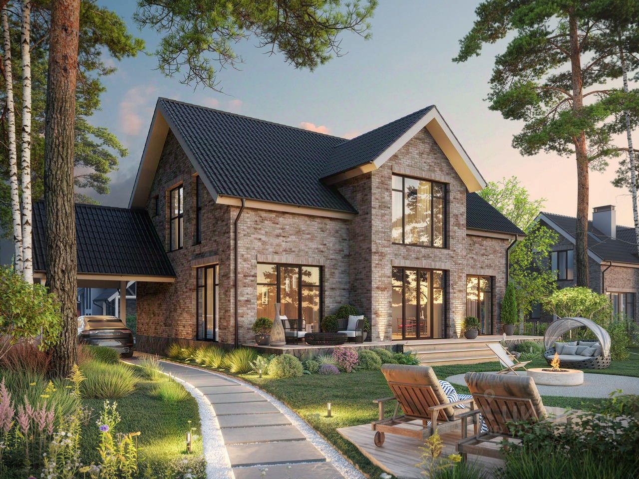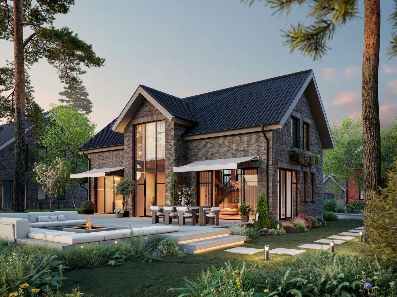Уютный дом 411 площадью 230 кв. м. на участке 6 соток. Просторная планировка, современные материалы и панорамные окна.