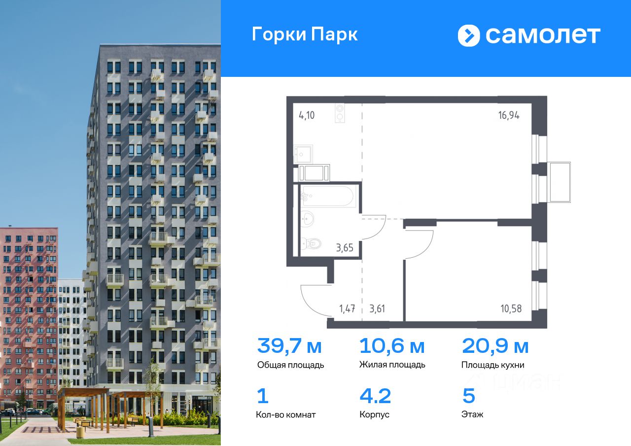 Предлагается 1-комнатная квартира комфорт-класса 39,7 кв.м в корпусе 4.2 на 5 этаже, в ЖК ''Горки Парк'' Квартира с чистовой отделкой. Доступность дополнительных опций уточняйте у застройщика.
