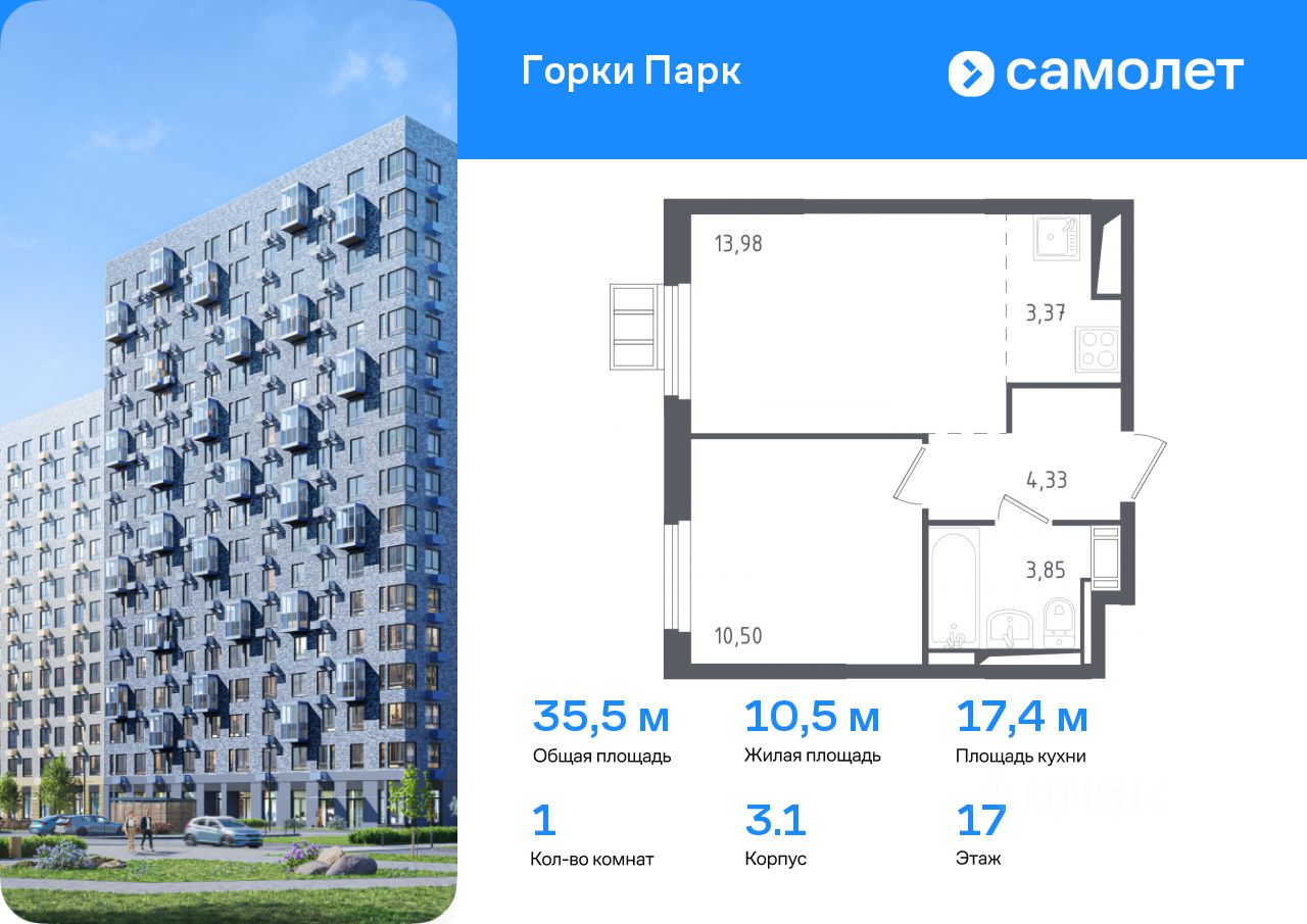 Предлагается 1-комнатная квартира комфорт-класса 35,5 кв.м в корпусе 3.1 на 17 этаже, в ЖК ''Горки Парк'' Квартира с чистовой отделкой. Доступность дополнительных опций уточняйте у застройщика.