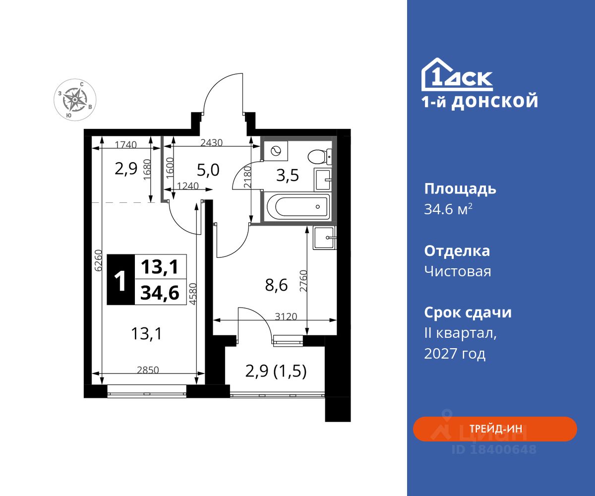 Максимальные скидки при 100% оплате. Trade-in вместо первоначального взноса - выгодно обменяйте вашу квартиру на новую! Прямая продажа от застройщика! Жилой Комплекс класса Комфорт плюс. Продаётся 1-к квартира номер 254 общей площадью 34.6 кв.м на 2-м этаже 24 этажного дома. Чистовая отделка.