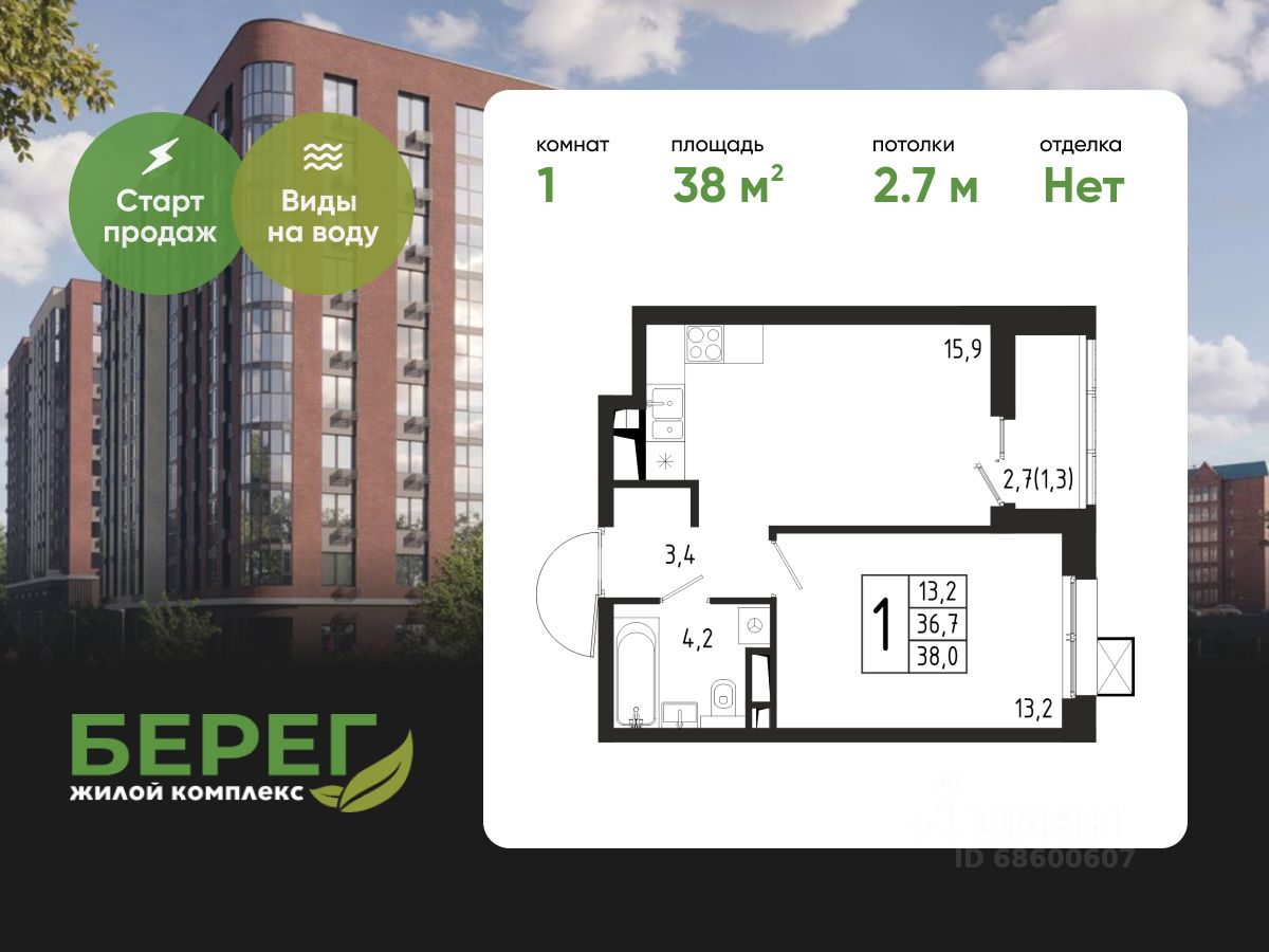 Продаётся 1-комнатная квартира в строящемся доме (Корпус 4 (2 очередь)), общей площадью 38.00 кв.м., на 5 этаже.