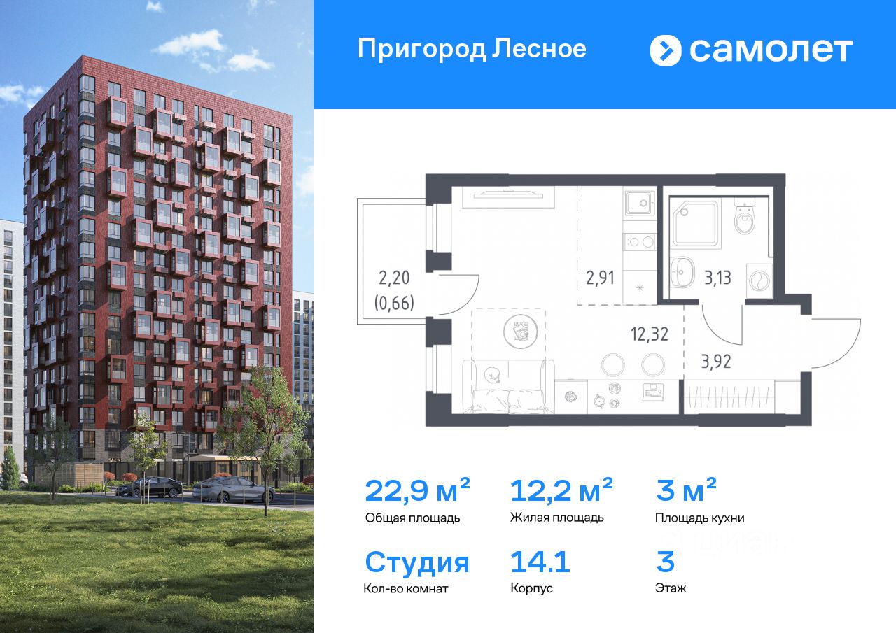 Предлагается квартира студия комфорт-класса 22,94 кв.м в корпусе 14.1 на 3 этаже, в ЖК ''Пригород Лесное'' Квартира с чистовой отделкой. Доступность дополнительных опций уточняйте у застройщика.