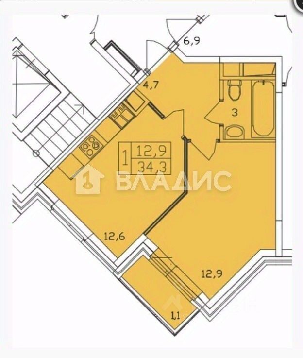 Общая площадь квартиры — 34,4 кв. м, жилая — 20 кв. м, площадь кухни — 10 кв. м. В квартире есть балкон, а окна выходят на улицу. Квартира угловая, с одним совмещённым санузлом. Потолки высотой 3 метра добавляют пространству воздуха и свободы.