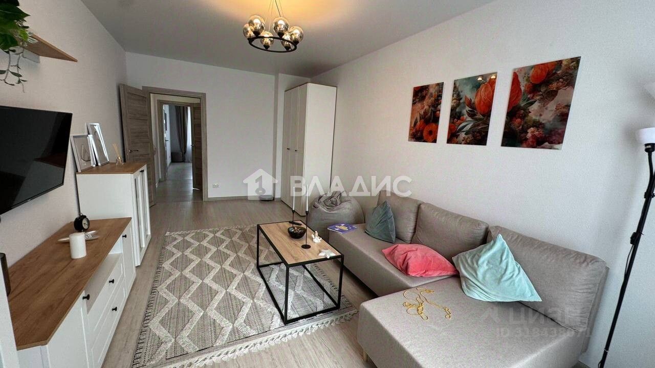 Квартира расположена на третьем этаже трёхэтажного кирпично-монолитного дома, построенного в 2024 году. Общая площадь квартиры составляет 57 кв. м, из которых 28 кв. м — жилая площадь, 10 кв. м — кухня. Высота потолков — 3 метра, что создаёт ощущение простора и свободы.