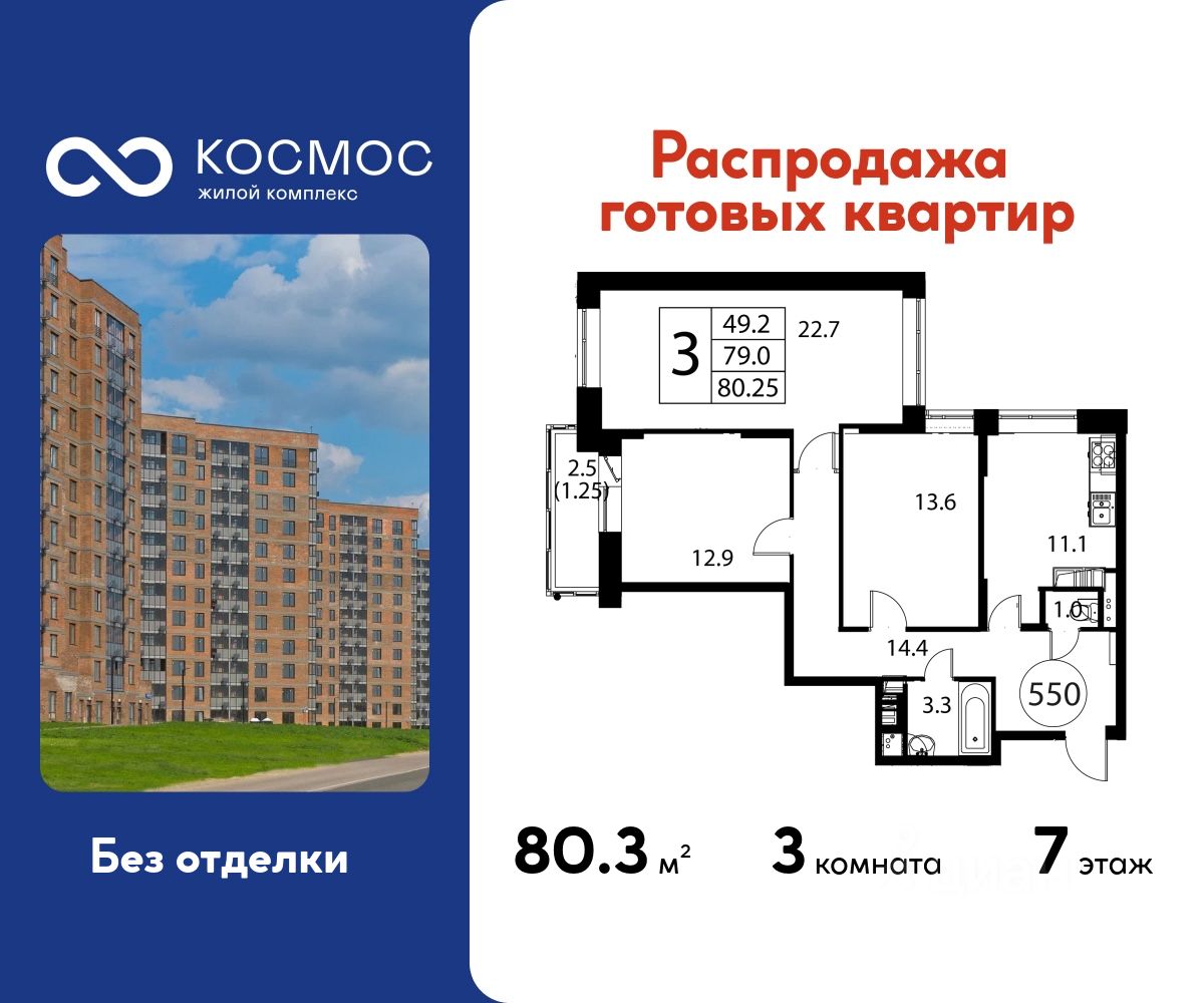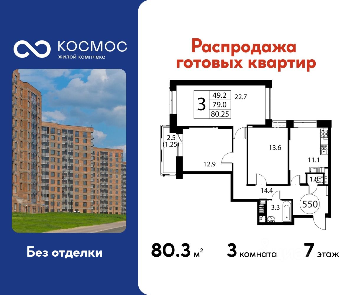 Продаётся 3-комнатная квартира в сданном доме (Корпус 3), срок сдачи: 2-кв. 2025, общей площадью 80.25 кв.м., на 7 этаже.