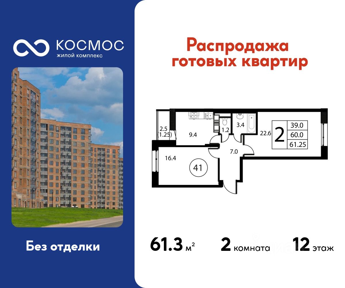Продаётся 2-комнатная квартира в сданном доме (Корпус 2), срок сдачи: 2-кв. 2025, общей площадью 61.25 кв.м., на 12 этаже.