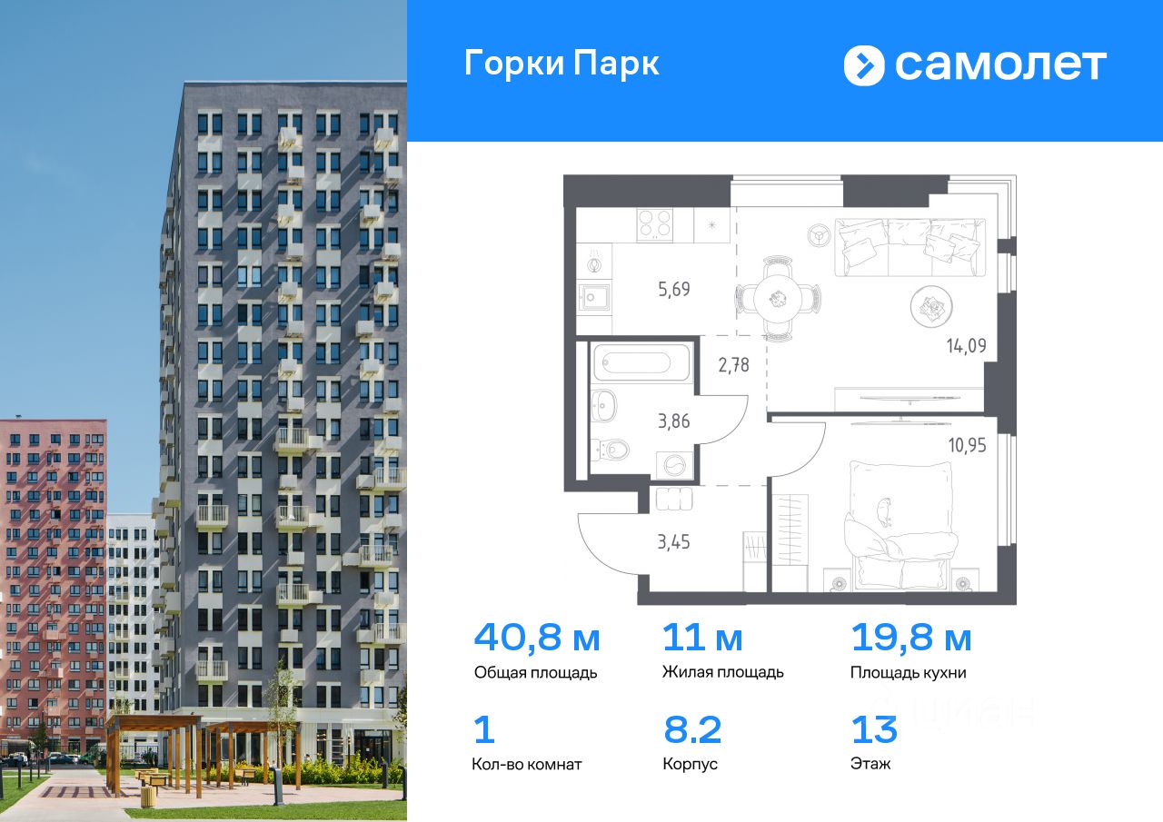 Предлагается 1-комнатная квартира комфорт-класса 40,82 кв.м в корпусе 8.2 на 13 этаже, в ЖК ''Горки Парк'' Квартира с чистовой отделкой. Доступность дополнительных опций уточняйте у застройщика.