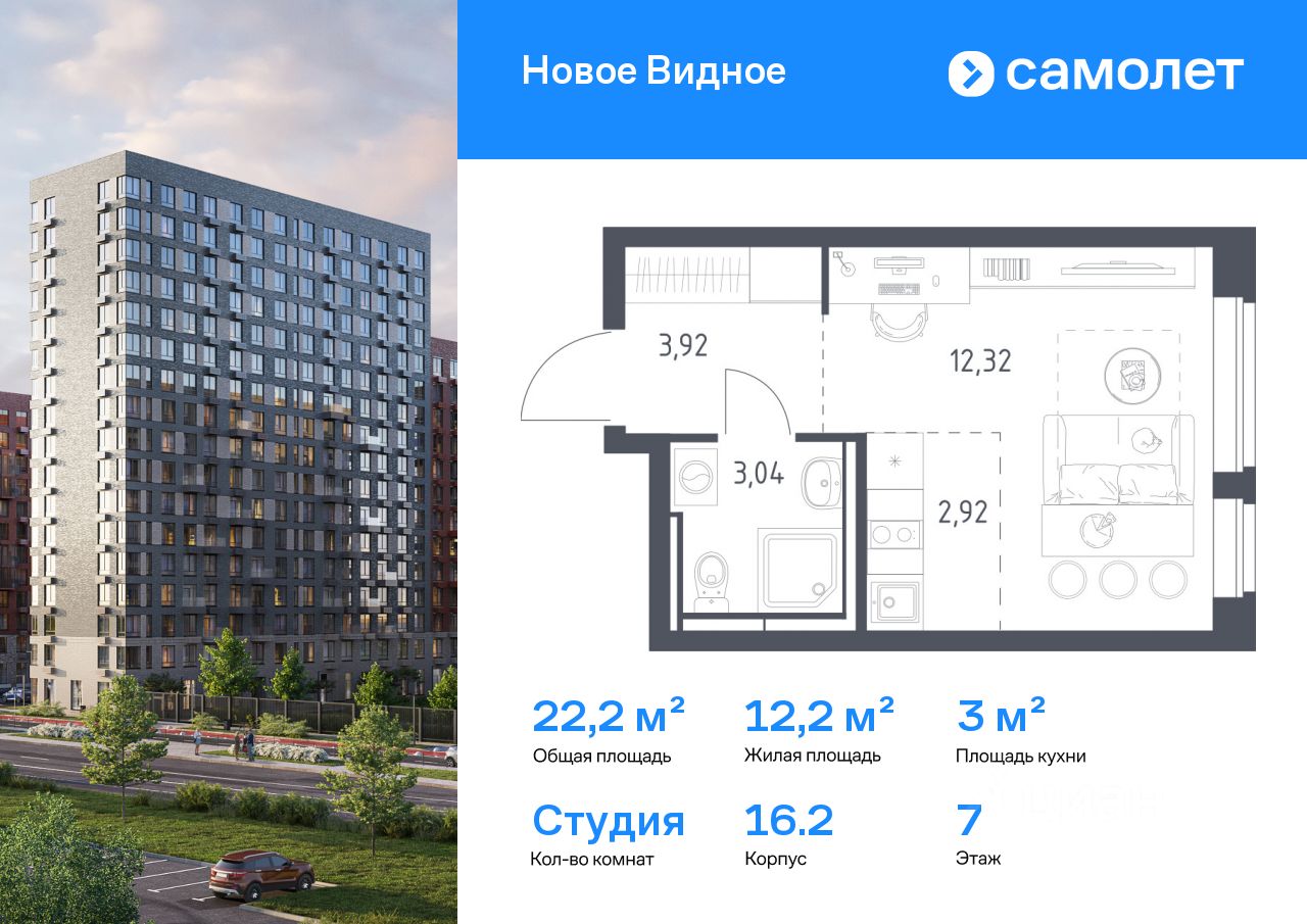 Строим кварталы для жизни с заботой о будущем. Предлагается квартира студия комфорт-класса 22,2 кв.м в корпусе 16.2 на 7 этаже, в ЖК ''Новое Видное'' Квартира с чистовой отделкой. Доступность дополнительных опций уточняйте у застройщика.