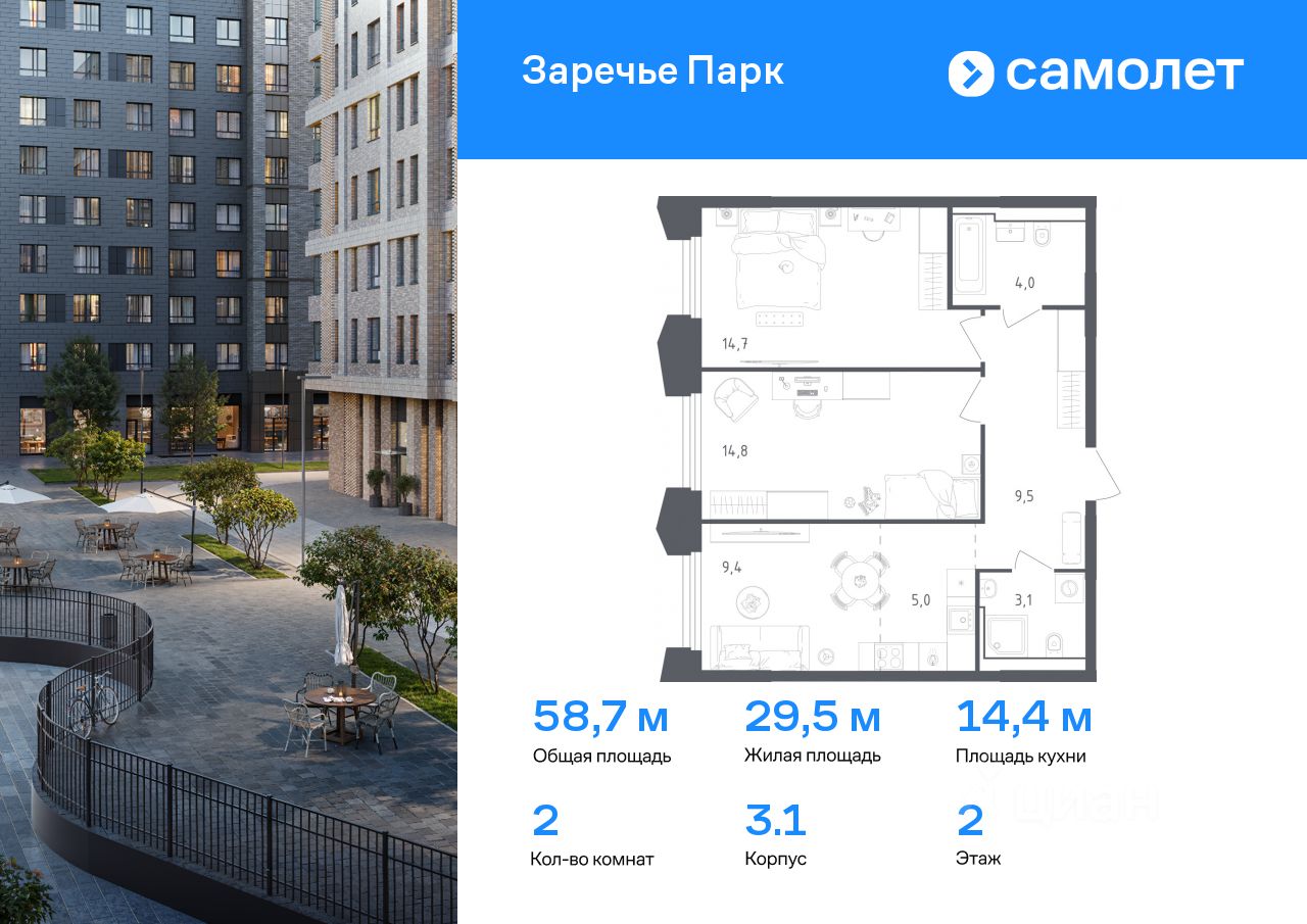 Предлагается 2-комнатная квартира бизнес-класса 58,7 кв.м в корпусе 3.1 на 2 этаже, в ЖК ''Заречье Парк'' Квартира с чистовой отделкой. Доступность дополнительных опций уточняйте у застройщика.