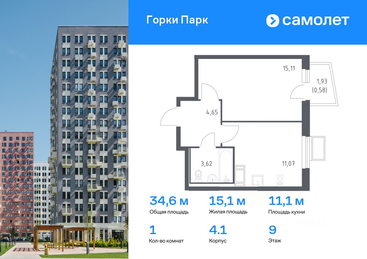 Предлагается 1-комнатная квартира комфорт-класса 34,6 кв.м в корпусе 4.1 на 9 этаже, в ЖК ''Горки Парк'' Квартира с чистовой отделкой. Доступность дополнительных опций уточняйте у застройщика.