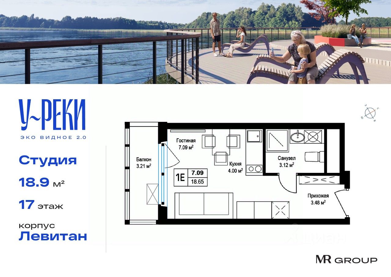 Прямая продажа от застройщика. Продаётся студия общей площадью 18.90 кв. м с чистовой отделкой в ЖК ''У реки. Эко Видное 2.0'' на 17-м этаже 17 этажного корпуса Левитан. Все корпуса введены в эксплуатацию. Выдача ключей - II кв. 2025г. Семнадцатиэтажный корпус ''Левитан'' состоит из 13 секций, образующих в плане закрытый периметр двора. Эко-повестка и комфорт — это формат осознанной жизни, разработанный ''Бюро А4'' для благоустройства корпуса ''Левитан''. В проекте развиваются две темы: образ реки и настроения пейзажей Левитана которые раскрываются через четыре функциональные зоны.