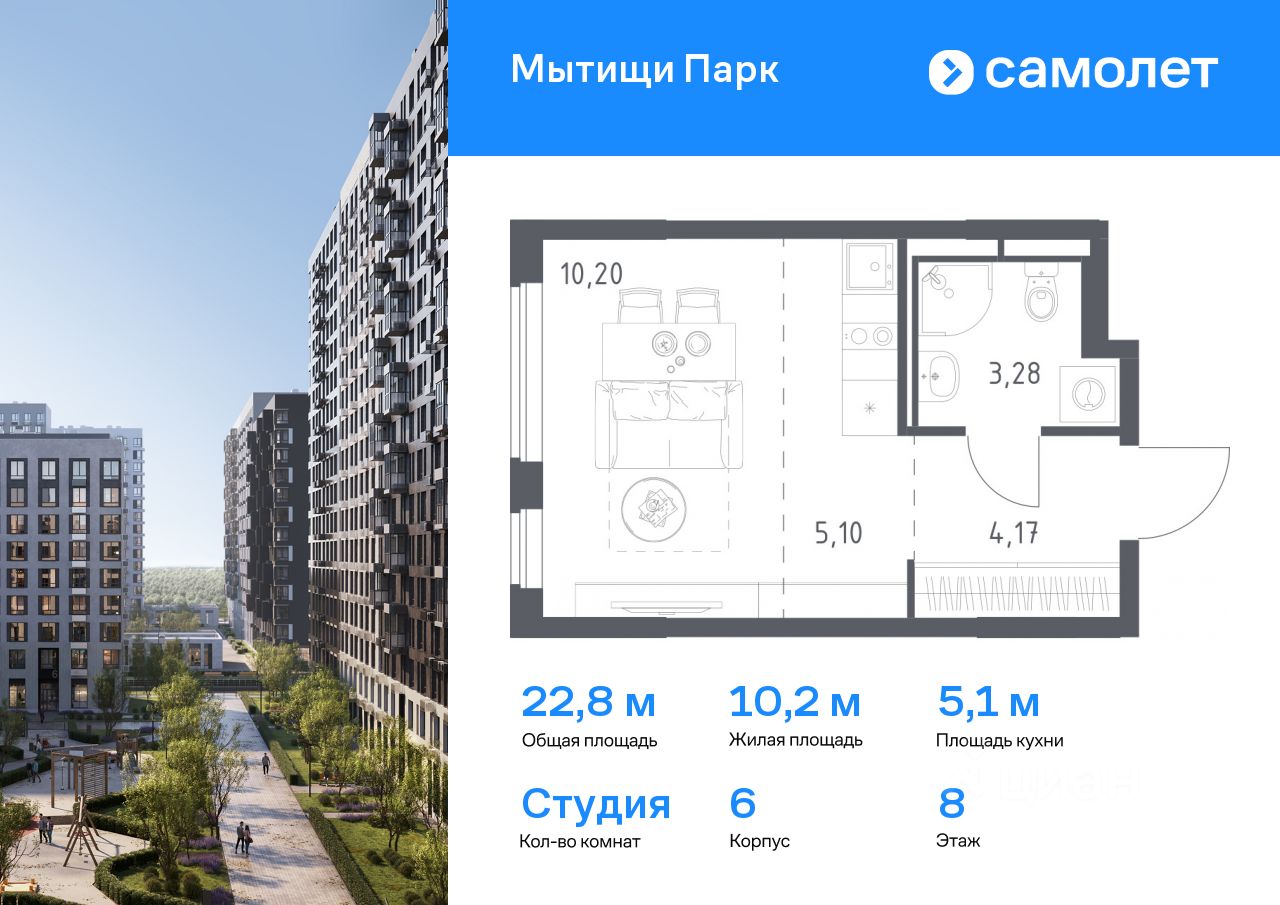 Предлагается квартира студия комфорт-класса 22,75 кв.м в корпусе 6 на 8 этаже, в ЖК ''Мытищи Парк''