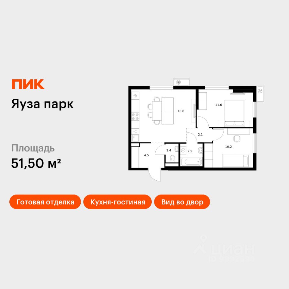 Продаётся 2-комн. квартира площадью 51,5 кв.м на 13 этаже 25 этажного дома (Корпус 11, Секция 1) проекта ПИК Яуза парк. Светлый просторный подъезд на уровне земли, функциональная планировка, большие окна, c отделкой.