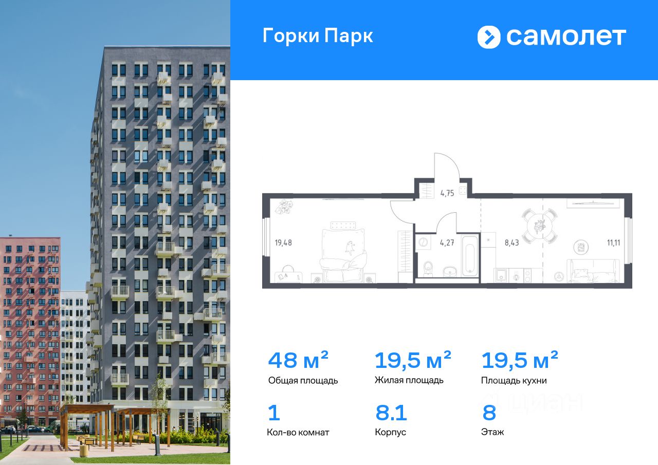 Строим кварталы для жизни с заботой о будущем. Предлагается 1-комнатная квартира комфорт-класса 48,04 кв.м в корпусе 8.1 на 8 этаже, в ЖК ''Горки Парк'' Квартира без отделки. Доступность опции ''отделка'' и возможность комплектации мебелью и декором уточняйте у застройщика.