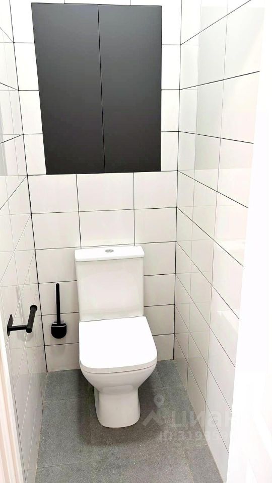 Полностью оборудованный САНУЗЕЛ (ванна, унитаз, раковина с навесным шкафом, стильное круглое зеркало, шкаф, полотенцесушитель).