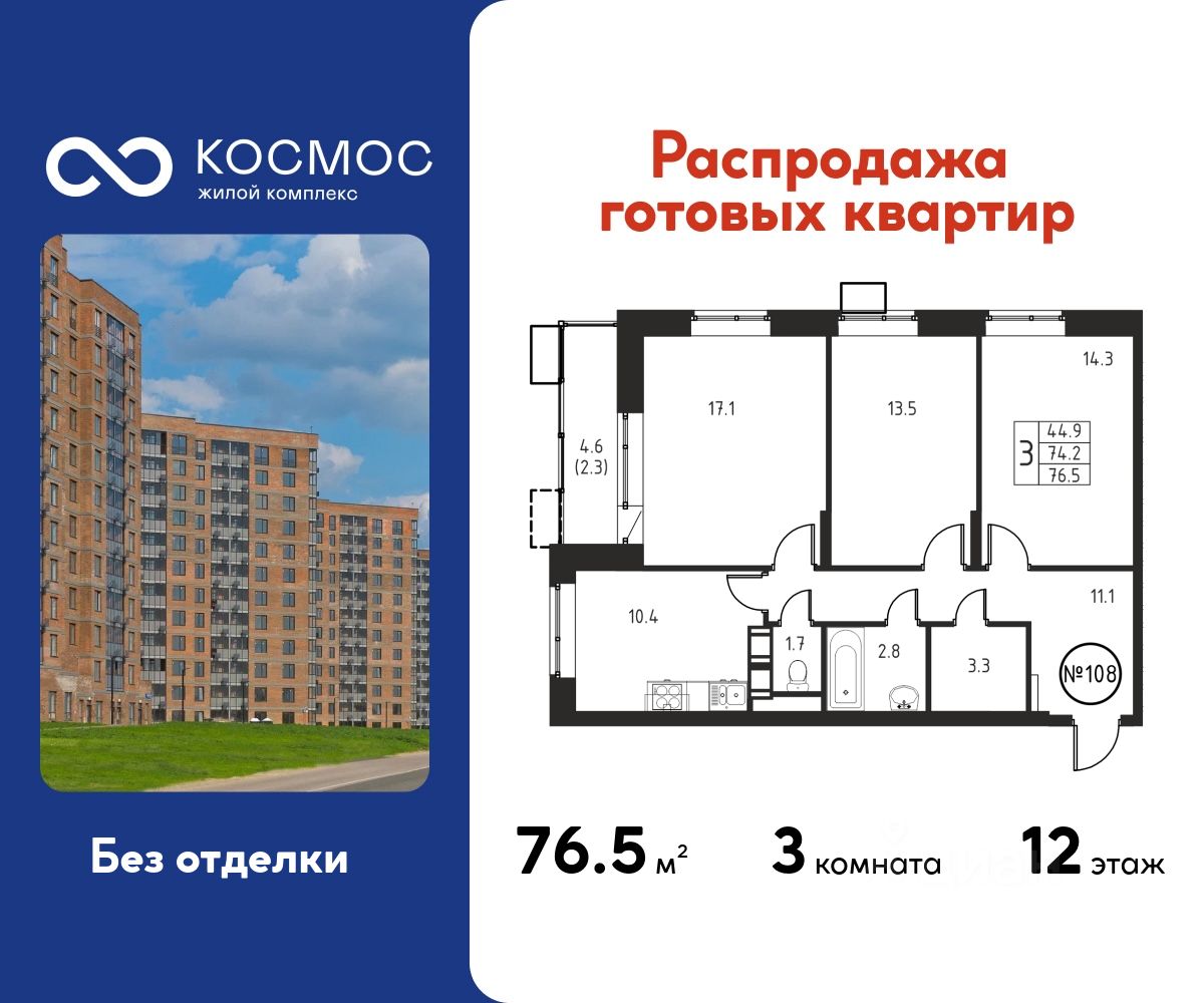 Продаётся 3-комнатная квартира в сданном доме (Корпус 5), срок сдачи: 2-кв. 2025, общей площадью 76.50 кв.м., на 12 этаже.