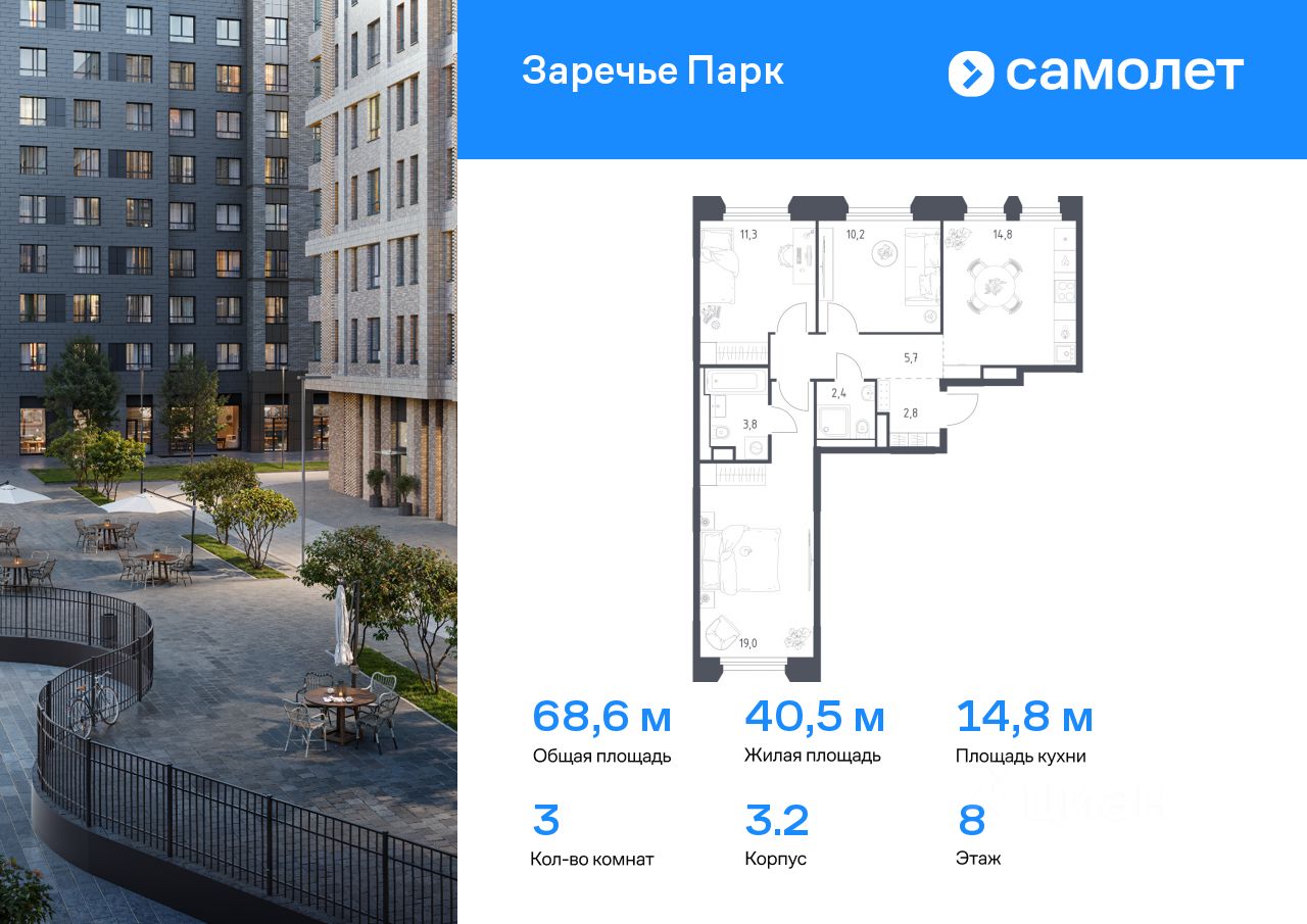 Строим кварталы для жизни с заботой о будущем. Предлагается 3-комнатная квартира бизнес-класса 68,6 кв.м в корпусе 3.2 на 8 этаже, в ЖК ''Заречье Парк'' Квартира с чистовой отделкой. Доступность дополнительных опций уточняйте у застройщика.