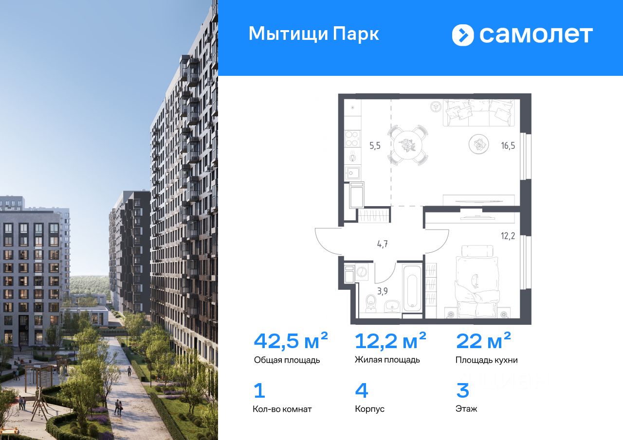 Строим кварталы для жизни с заботой о будущем. Предлагается 1-комнатная квартира комфорт-класса 42,5 кв.м в корпусе 4 на 3 этаже, в ЖК ''Мытищи Парк''