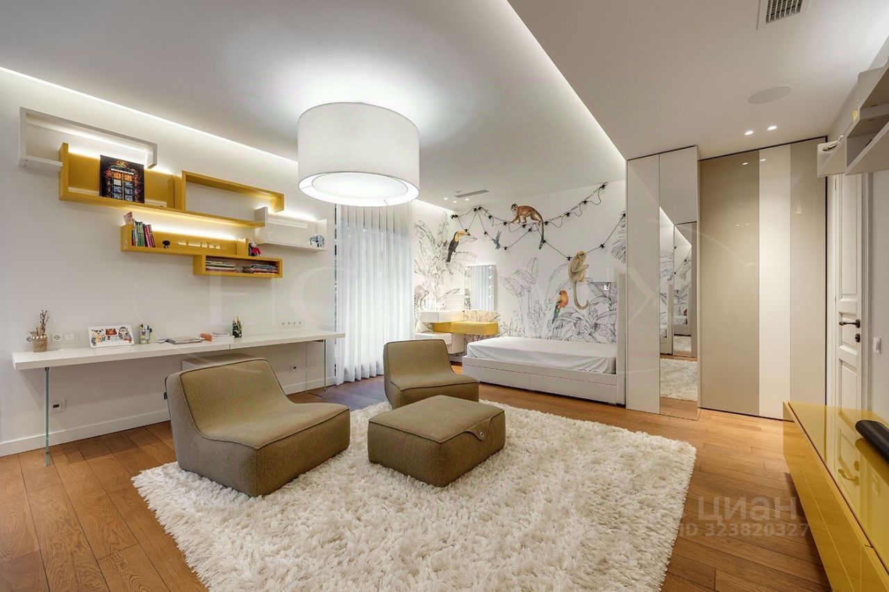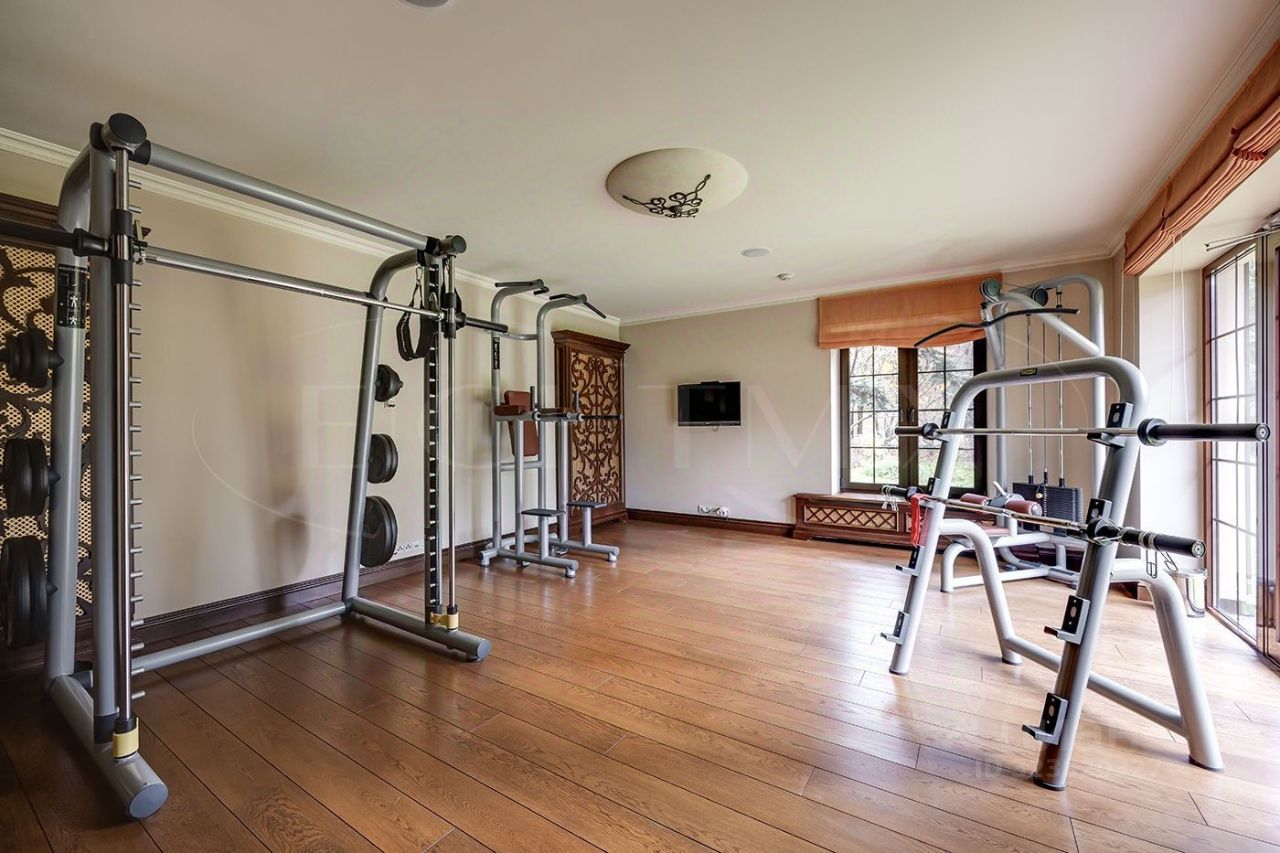 Функциональная планировка включает: - 1 этаж: холл, разделенные гостиная, столовая и кухня, детская спальная комната с гардеробной и с/у, гостевая комната, небольшой кинозал, спортзал, постирочная, -2 этаж: 2 спальни с собственными гардеробными и с/у и кабинет. В доме 2 террасы на 1 этаже и на балконе 2 этажа.