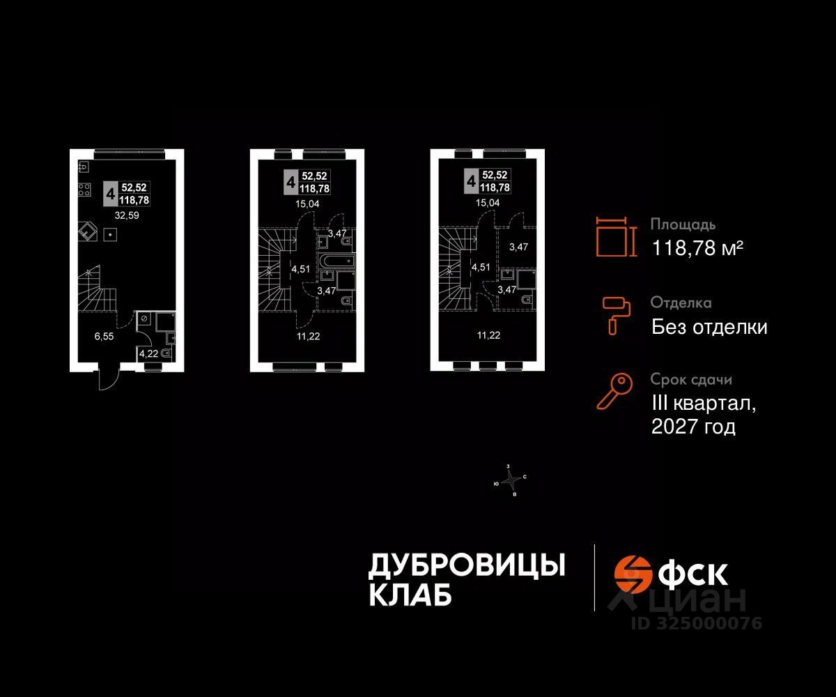 Прямая продажа от застройщика! Загородный жилой комплекс комфорт-класса. Продаётся 4-к таунхаус 7 общей площадью 118.78 кв.м. Без отделки.