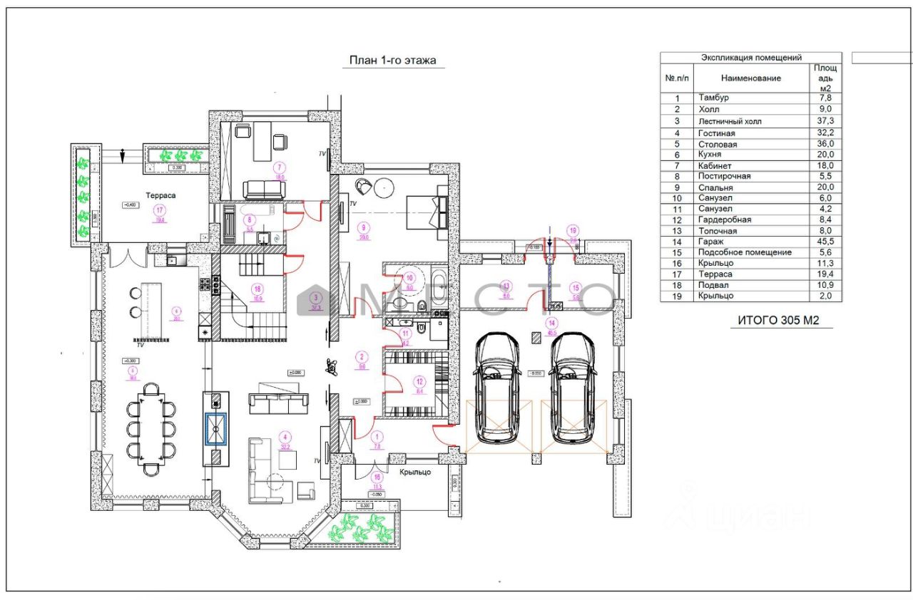 Основной дом 472 м2: 1 этаж: - Гостиная со вторым светом и дровяным камином - Столовая - Кухня - Кабинет - Постирочная - Мастер- спальня - Гостевой сан.узел - Гардеробная - Терраса - Гараж на 2 машины
