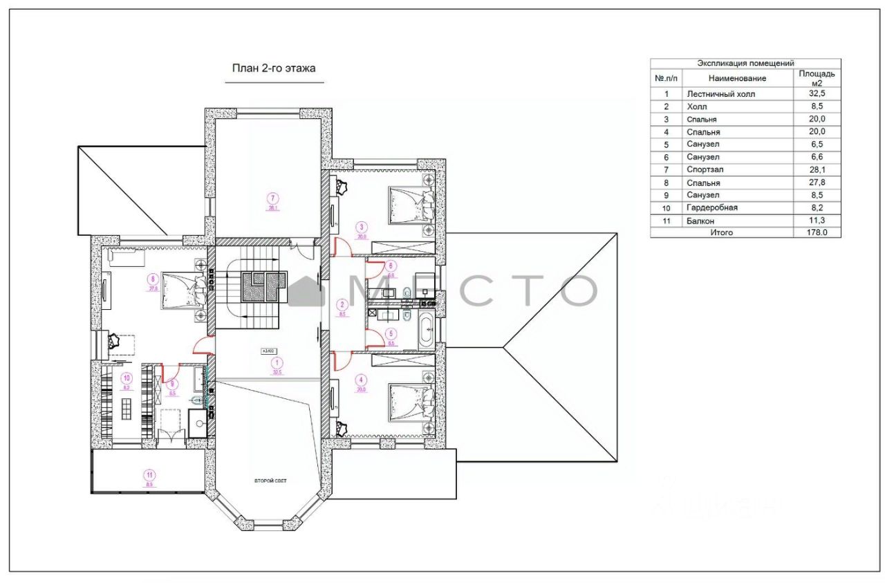2 этаж: - Мастер спальня с сан.узлом и гардеробной и выходом на лоджию - 2 спальни - 2 сан.узла - Спорт зал