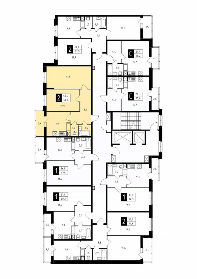 Продаётся 2-комнатная квартира в строящемся доме (Корпус 1), срок сдачи: 1-кв. 2026, общей площадью 54.40 кв.м., на 6 этаже.
