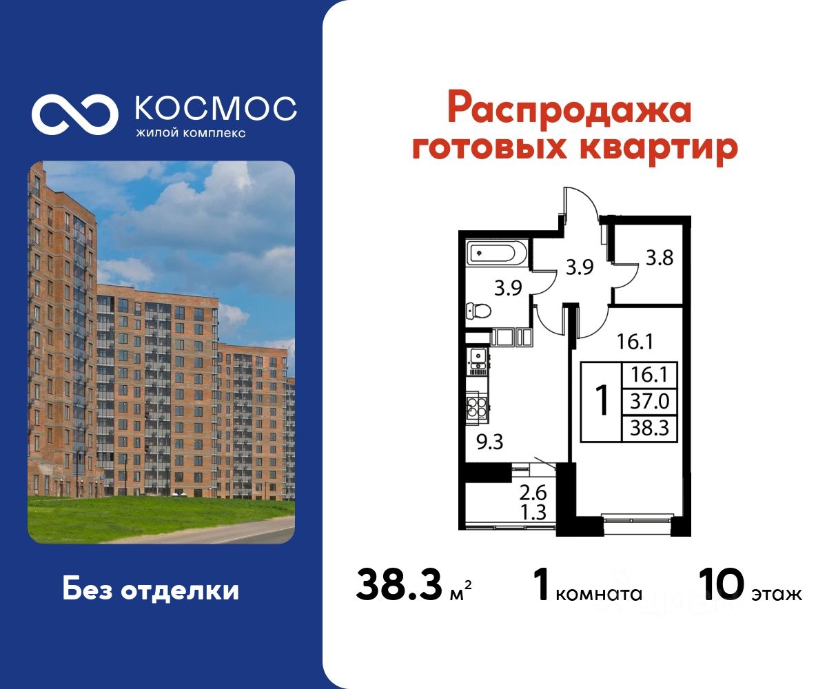 Продаётся 1-комнатная квартира в сданном доме (Корпус 3), срок сдачи: 2-кв. 2025, общей площадью 38.30 кв.м., на 10 этаже.