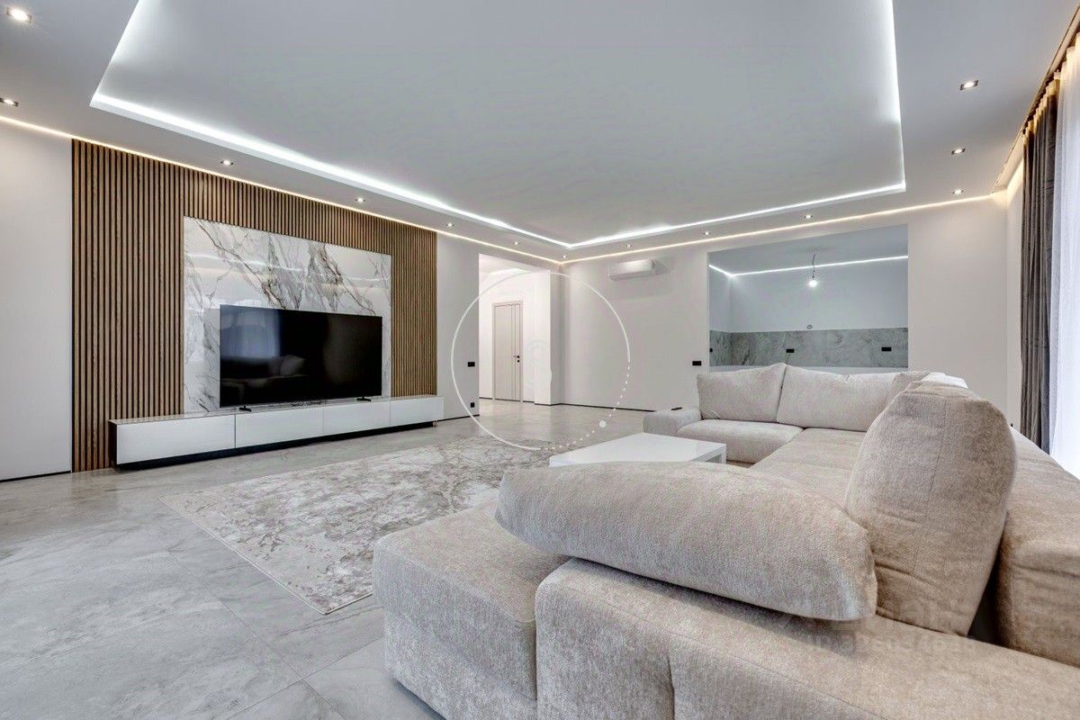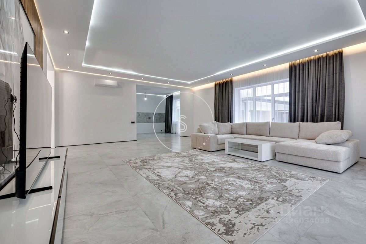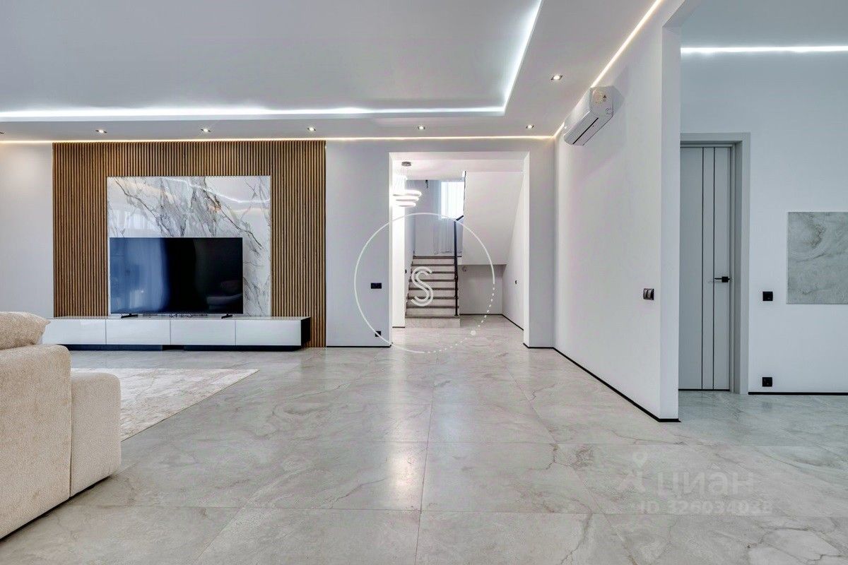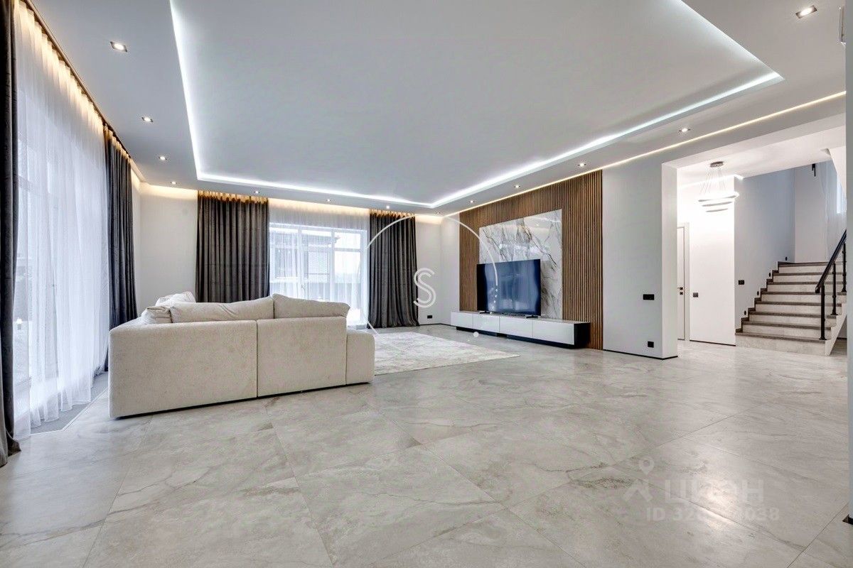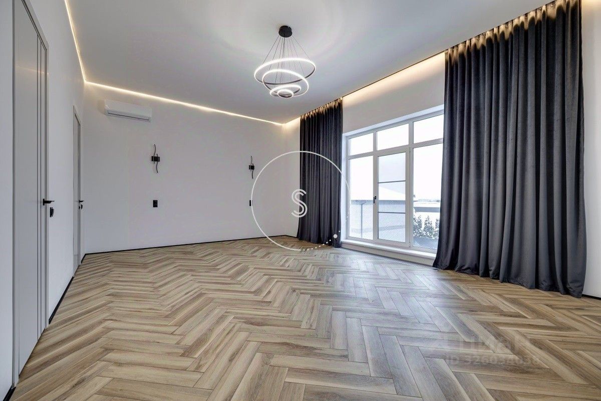 Лот 4438. Предлагается новый дом 280 кв.м. + 90 кв.м. отдельное строение с гаражом на 4 машино-места и зоной барбекю, на участке 9 соток. Новый ремонт в современном стиле. Панорамное остекление. Кондиционирование. Высота потолков на 1 этаже 3,15 м, на 2 этаже 3,3 м. Планировка: 1 этаж - холл, спальня, санузел, гостиная-кухня (из кухни выход на участок). 2 этаж - 4 спальни со своими санузлами, выход на балкон. Выполнен ландшафтный дизайн, освещение. Водоснабжение и газ центральные, канализация септик.