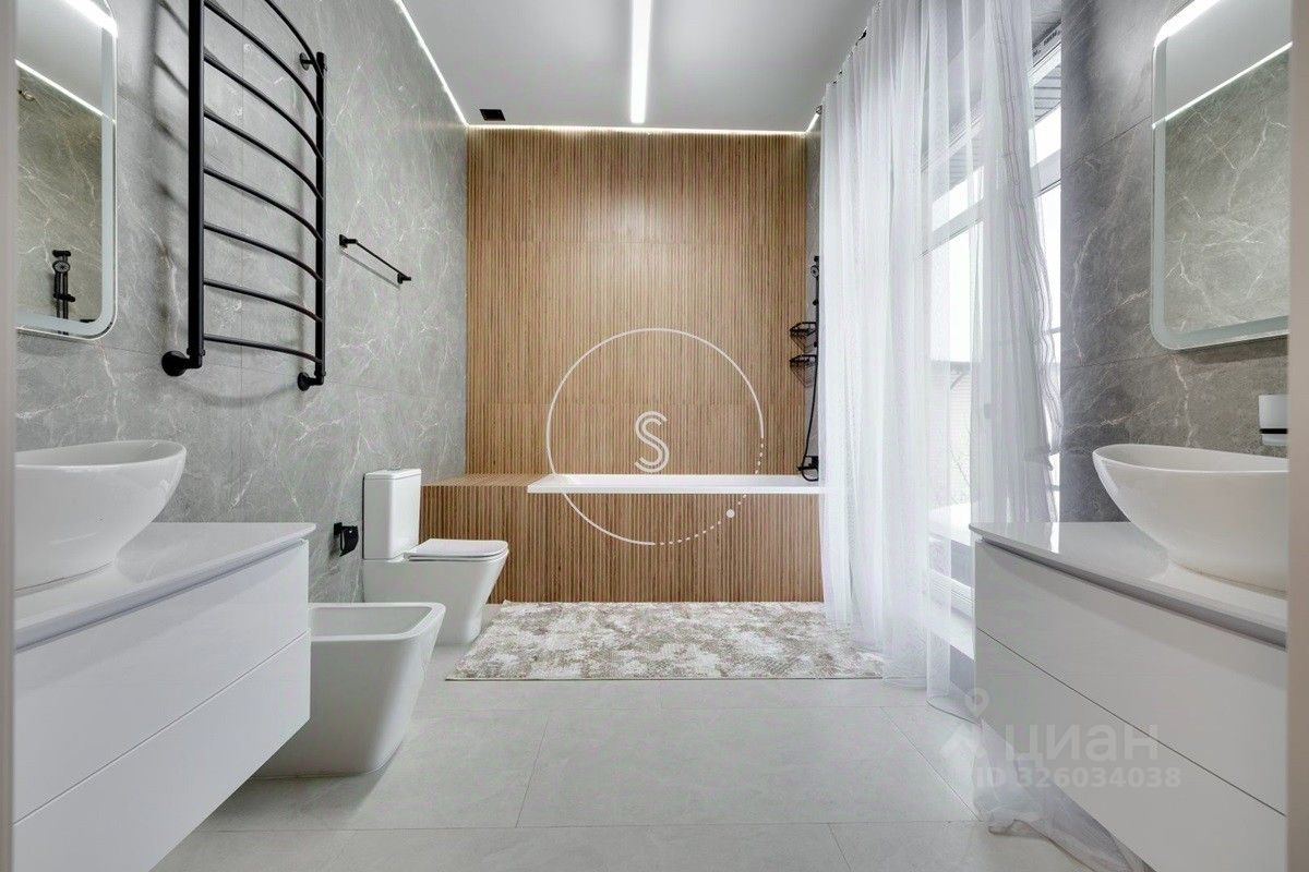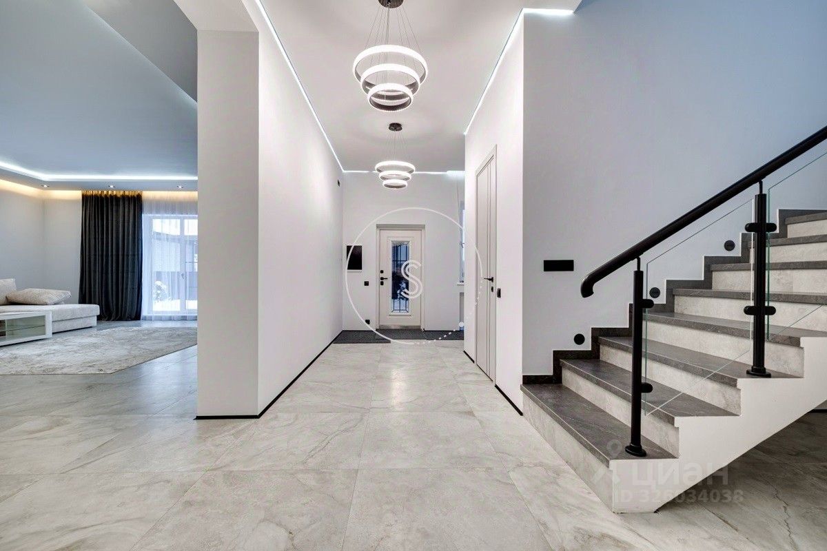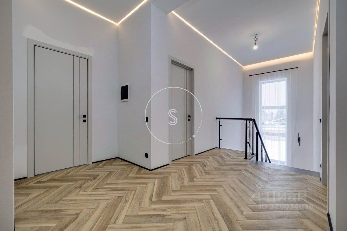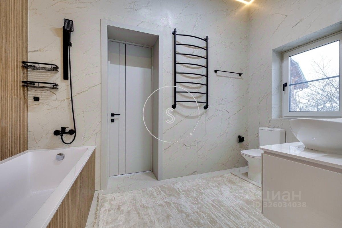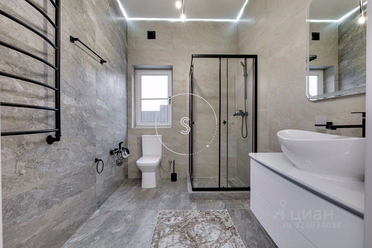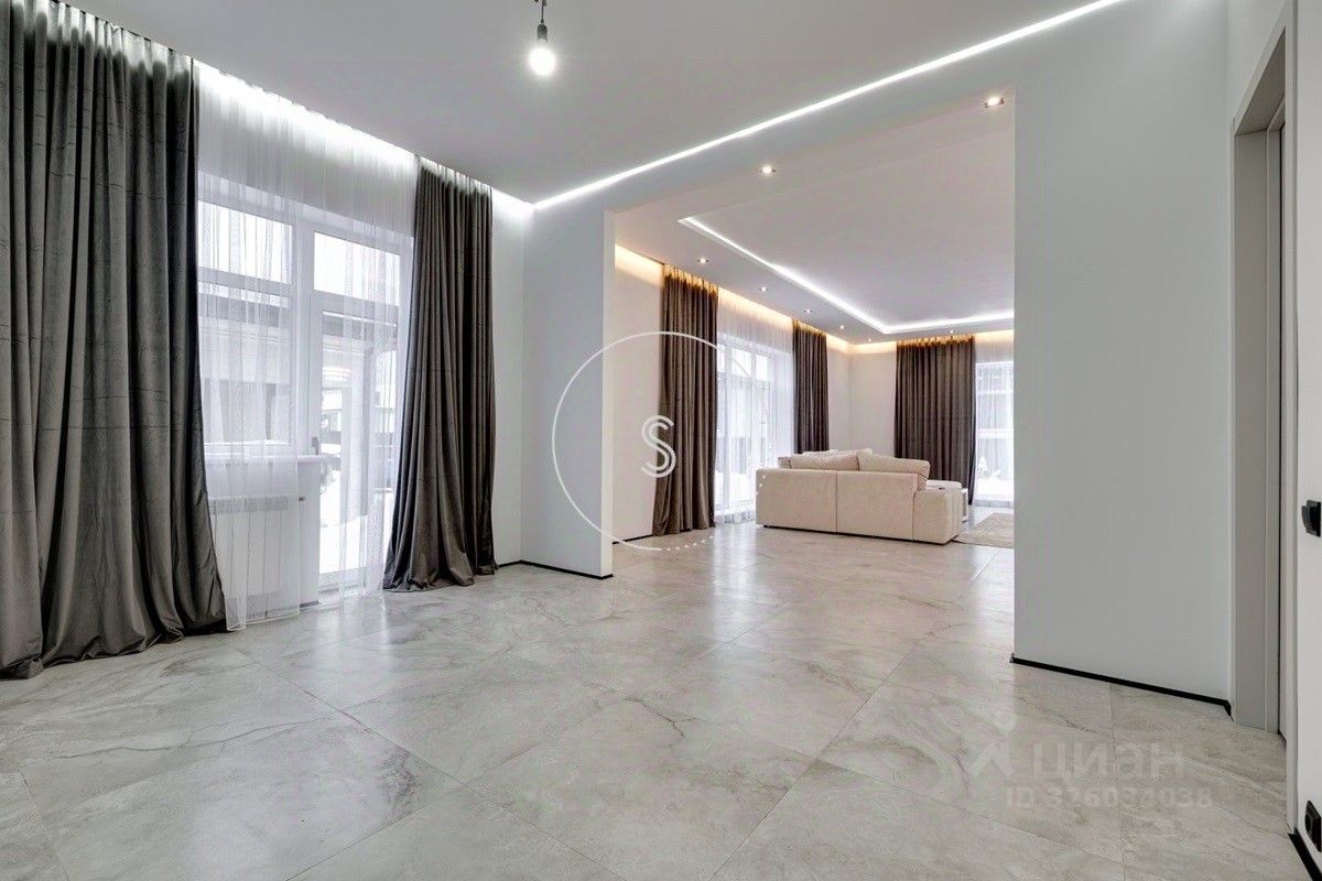 Лот 4438. Предлагается новый дом 280 кв.м. + 90 кв.м. отдельное строение с гаражом на 4 машино-места и зоной барбекю, на участке 9 соток. Новый ремонт в современном стиле. Панорамное остекление. Кондиционирование. Высота потолков на 1 этаже 3,15 м, на 2 этаже 3,3 м. Планировка: 1 этаж - холл, спальня, санузел, гостиная-кухня (из кухни выход на участок). 2 этаж - 4 спальни со своими санузлами, выход на балкон. Выполнен ландшафтный дизайн, освещение. Водоснабжение и газ центральные, канализация септик.